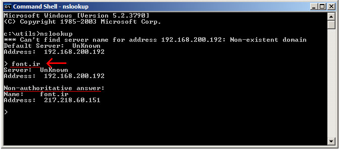 خط سوم عبارت Non-authoritative را مشاهده میکنیم. این عبارت به این معنی است که سرور 192.168.200.192، مرجع پایه اطلاعات دامنه font.ir نیست و آن را در اختیار ندارد، لذا فرایند resolve را برای دریافت آنها آغاز کرده است و اطلاعات مربوط به این دامنه را از سرور دیگری دریافت کرده است.