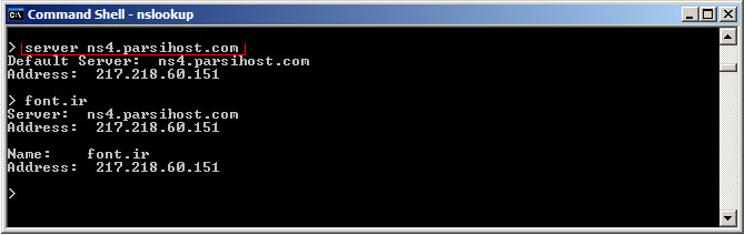 همانطور که در شکل می بینید، به کمک دستور server ns4.parsihost.com، سرور پیش فرض را به ns4.parsihost.com تغییر میدهیم. این بار در جوابی که برای font.ir مشاهده میکنیم عبارت Non-authoritative دیده نمی شود. در واقع در اینجا ns4.parsihost.com مرجع پایه اطلاعات دامنه font.ir است.