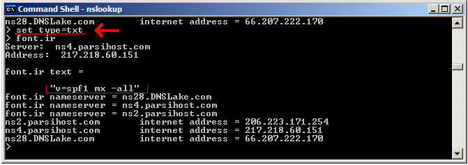 برای مثال دستور set type=txt را تایپ می کنیم و مجددا درباره دامنه font.ir پرس و جو می کنیم.