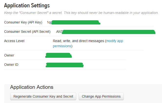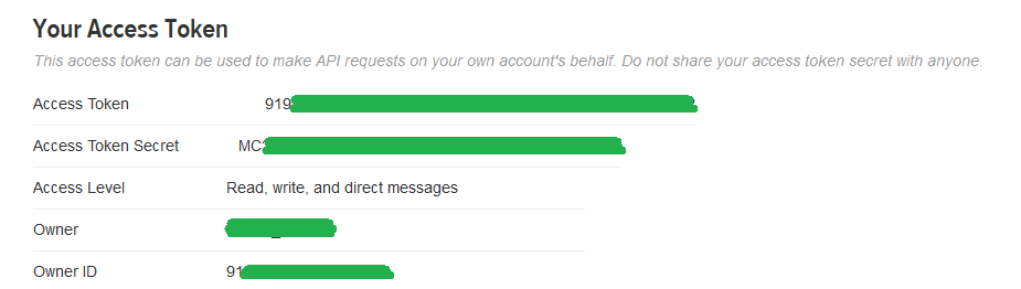 3. در نهایت می توانید کد های Token و سطوح دسترسی و رمز آن ها مشاهده نمایید. برای استفاده از توییتر نرم افزار خود باید از این کد ها در نرم افزار خود استفاده نمایید.