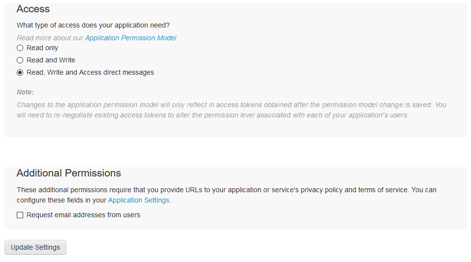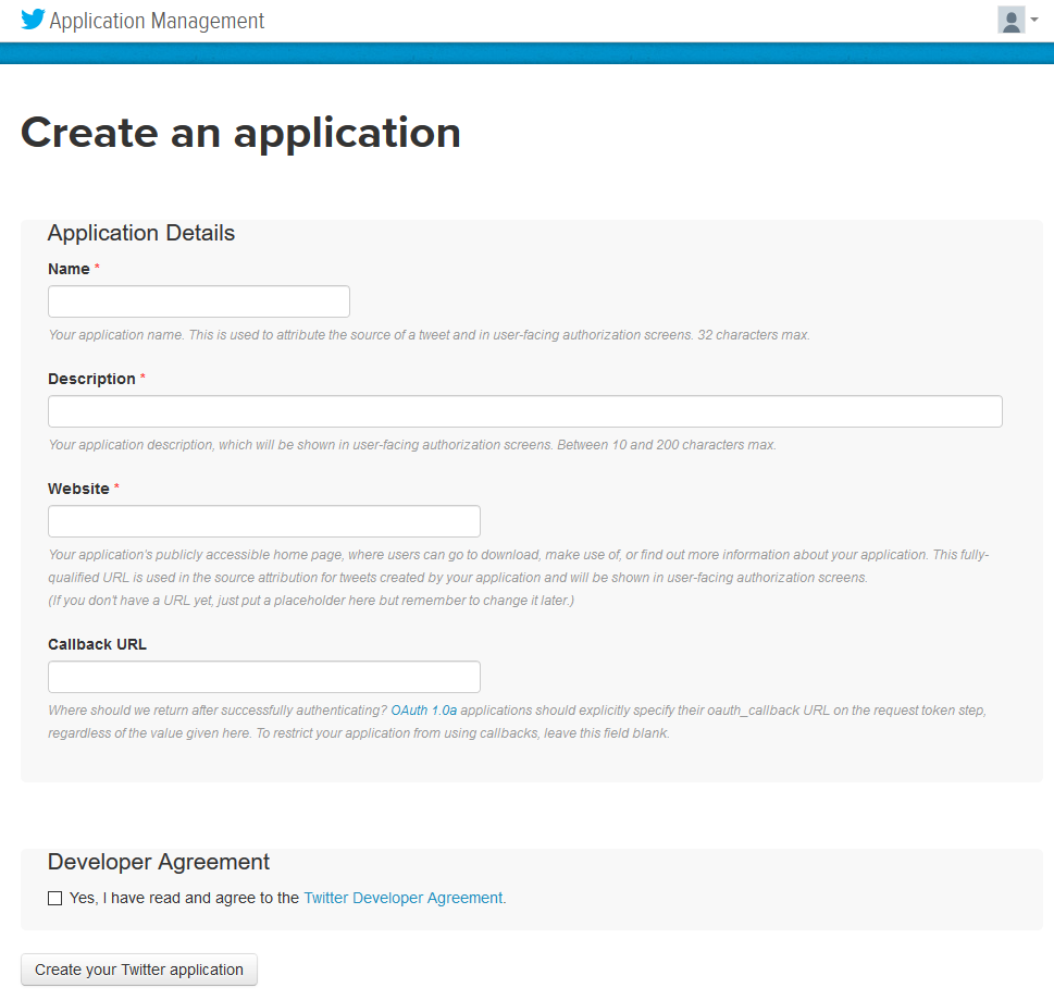 سپس از لینک https://apps.twitter.com اقدام به ایجاد Twitter Application برای دریافت دسترسی به Token مربوطه نمایید. مطابق تصویر زیر برای این منظور باید اطلاعات مورد نیاز را تکمیل نمود: